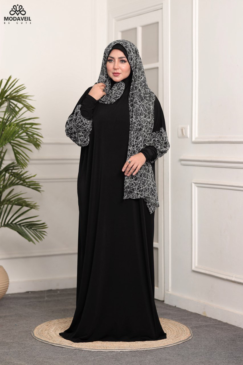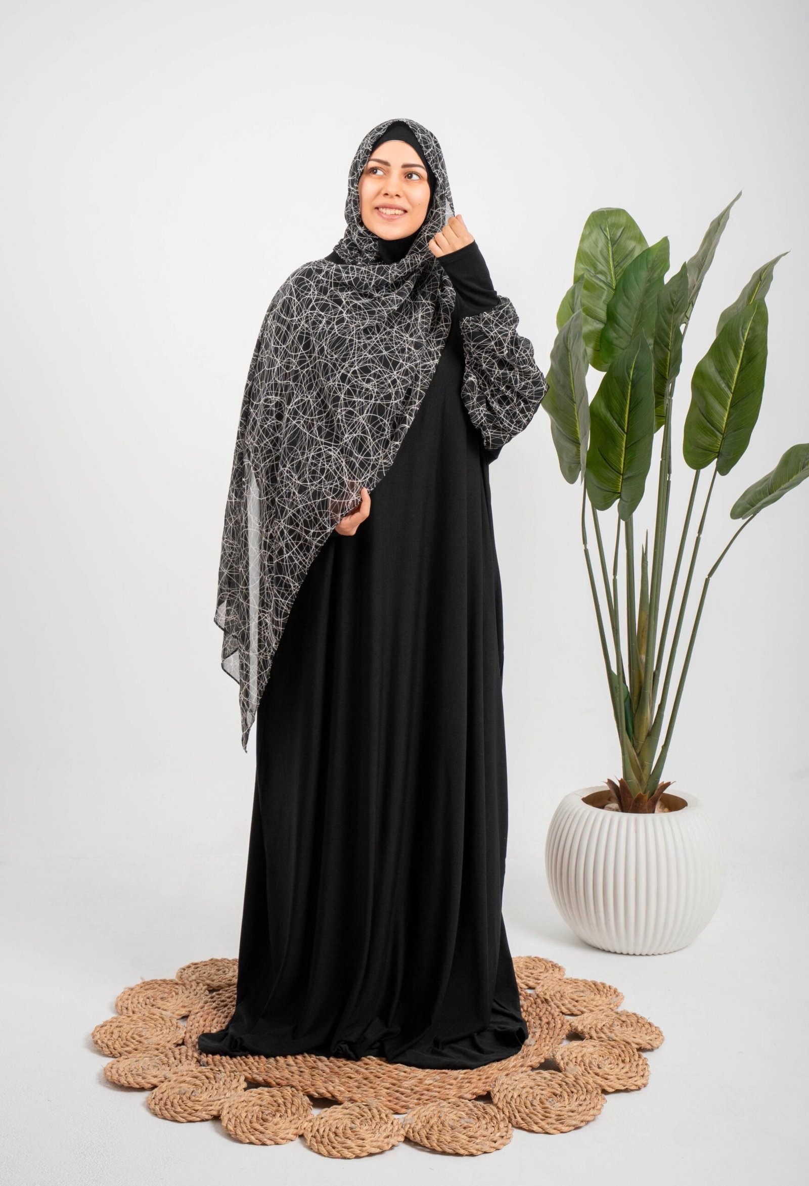 إسدال صلاة فيزون عملي بخامة مريحة وطرحة شيفون بنفس النقشة. تصميم فضفاض يناسب جميع المقاسات، مثالي للصلاة والاستخدام اليومي مع شحن سريع لجميع محافظات مصر