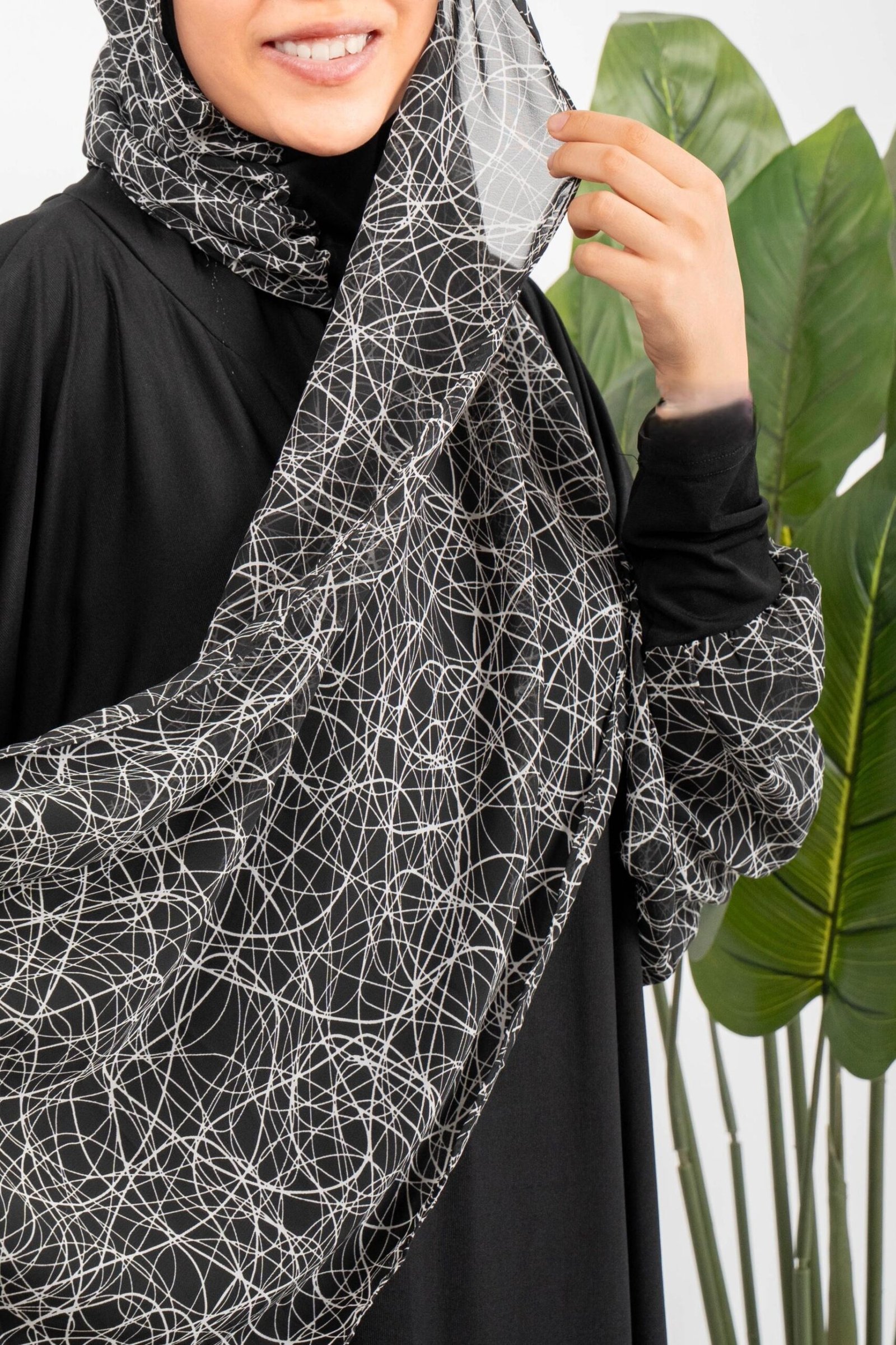تصميم أنيق باللون الأسود مع طرحة منقوشة.